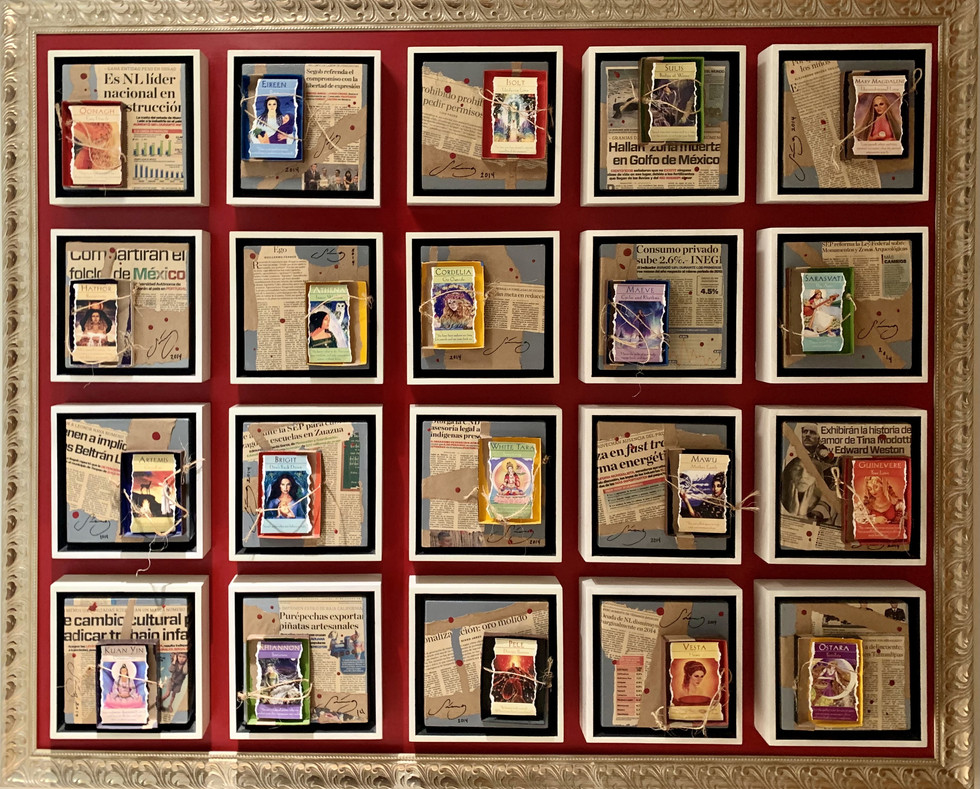 Comencé a trabajar con oráculos en el 2013. Mi primera exposición con este tema fue en el 2014 “Oráculo Anónimo” una colección de 44 piezas individuales que referenciaban nuestra directa participación en el devenir político, económico y social a través del pensamiento, la comunicación y la omisión de, en el colectivo humano: ese campo energético que a todos nos influye, y, cuyo contenido ancestral, penetra y configura el 95% de nuestra psique: el subconciente.